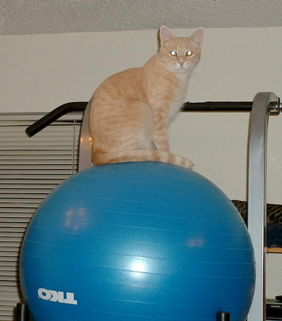 Valentine on my exercise ball. (This is why those balls never seem to last very long. I lifted him carefully off of it, in hopes that it had escaped puncture, but within a few hours it was a deflated heap on the floor.)